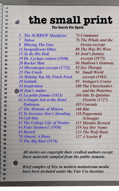 In the six years since “the small print” began collecting modern versions of those stories, dozens of authors have written over a million words on the subject. You are holding some of the best of that output. 32 writers have generously provided their stories for your enjoyment. Whether you're a connoisseur of Size fiction or new to the genre, there is something in these pages for everyone. Sex and violence. Chastity and peace. Subhuman desires alongside angelic aspirations.